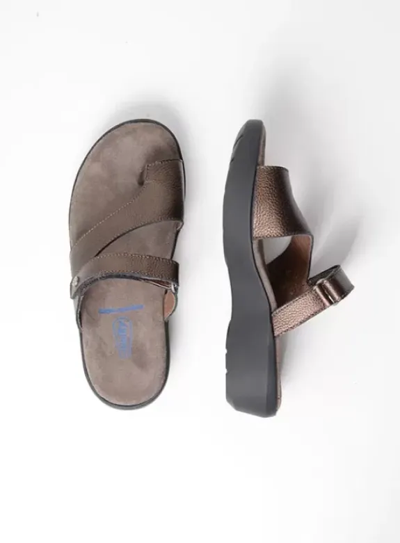 Wat direct opvalt bij slipper Collins is de brede diagonale band over de wreef. Die zorgt voor extra stabiliteit en ondersteuning. Het voetbed is afgewerkt met een suède dekje, dat heerlijk zacht aanvoelt aan je voeten. Onder dit dekje hebben we een laag memory foam aangebracht, die zorgt voor demping bij elke stap. Ook de hakhoogte is ideaal: zo wordt lopen makkelijker gemaakt. De grote teen is voor een groot deel omsloten met leer. Hierdoor wordt de voorvoet goed op zijn plek gehouden. Een eventuele lichte knok (bobbel bij de aanzet van de grote teen) blijft zo ook mooi ‘binnen boord’. Door de klittenbandsluiting op de wreef kan je de slipper goed afstellen om de voet. Bij de Collins in effen leersoorten zit er een mooi vlechtwerk op deze wreefband.