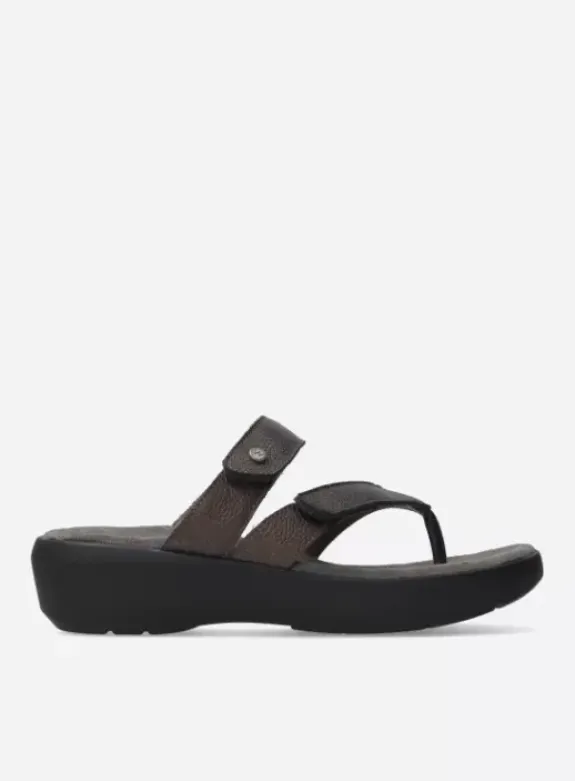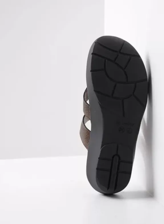 Chique en comfortabel, dat is de Hobie ten voeten uit. Het voetbed is afgewerkt met een suède dekje, dat heerlijk zacht aanvoelt aan je voeten. Onder dit dekje hebben we een laag memory foam aangebracht, die zorgt voor demping bij elke stap. De Hobie is niet helemaal plat, maar is net wat hoger onder de hak, waardoor je makkelijker loopt. Met de twee klittenbandsluitingen op de wreef en de voorvoet, stel je de slipper binnen no-time perfect af om je voet, zodat je niet met je tenen hoeft te ‘knijpen’ om de slipper aan te houden. De Hobie is verkrijgbaar in diverse (glimmende en effen) leersoorten.